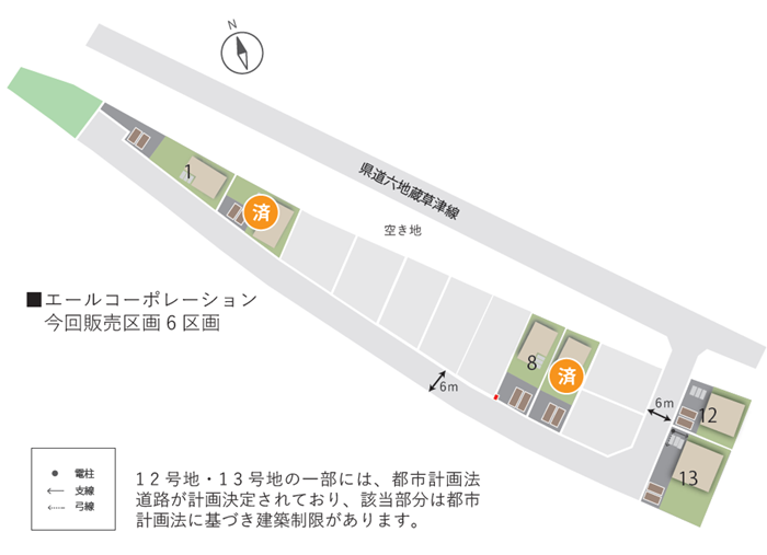 | 備考 | ・12号地、13号地の一部には、土地計画法道路が計画決定されており、該当部分は都市計画法に基づき建築制限があります。 | ||