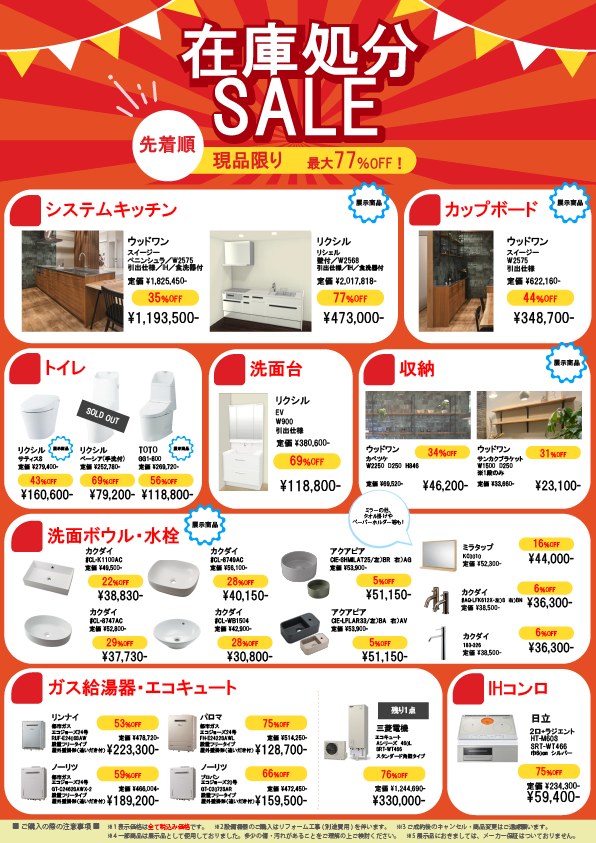 先着順!!現品限り!!の在庫処分SALEを開催しております!