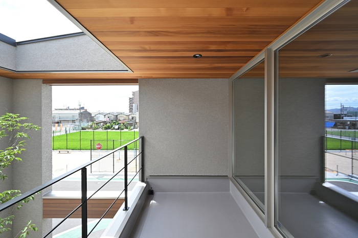 外壁材や軒天井の素材を内部壁面にも連続して使用することで、家の中でもまるで外に居るようなのびのびとした空間を演出しています。