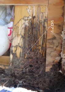 今回の現場は雨漏れが原因で湿気を帯びてシロアリが発生したようです。