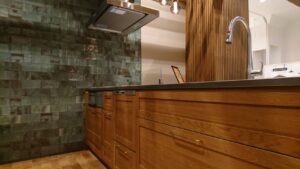 緑色の壁面タイルが印象的なキッチンとなっております。